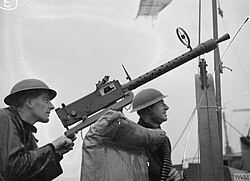 The Gun, Machine, Vickers, .5-inch, Mk. III was used as an anti-aircraft gun on British ships.[21] This variation was typically four guns mounted on a 360° rotating and (+80° to −10°) elevating housing. The belts were rolled into a spiral and placed in hoppers beside each gun. The heavy plain bullet weighed 1.3 oz (37 g) and was good for 1,500 yd (1,400 m) range. Maximum rate of fire for the Mark III was about 700 rpm from a 200-round belt carried in a drum. They were fitted from the 1920s onwards, but in practical terms, proved of little use. During the Second World War, the naval 0.5 in (12.7 mm) version was also mounted on power-operated turrets in smaller watercraft, such as Motor Gun Boats and Motor Torpedo Boats.