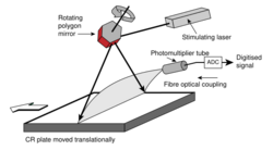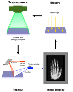From Handwiki Photostimulated luminescence (PSL) is the release of stored energy within a phosphor by stimulation with visible light, to produce a luminescent signal. X-rays may induce such an energy storage. A plate based on this mechanism is called a photostimulable phosphor (PSP) plate and is one type of X-ray detector used in projectional radiography. Creating an image requires illuminating the plate twice: the first exposure, to the radiation of interest, "writes" the image, and a later, second illumination (typically by a visible-wavelength laser) "reads" the image. The device to read such a plate is known as a phosphorimager (occasionally spelled phosphoimager, perhaps reflecting its common application in molecular biology for detecting radiolabeled phosphorylated proteins and nucleic acids). Projectional radiography using a photostimulable phosphor plate as an X-ray detector can be called "phosphor plate radiography"[1] or "computed radiography"[2] (not to be confused with computed tomography which uses computer processing to convert multiple projectional radiographies to a 3D image).