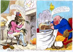 French Liberty. British Slavery (1792), James Gillray caricatured French "liberty" as the opportunity to starve and British "slavery" as bloated complaints about taxation.