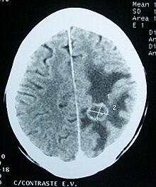 A brain tumor occurs when abnormal cells form within the brain.[2] There are two main types of tumors: cancerous (malignant) tumors and benign (non-cancerous) tumors.[2] Cancerous tumors can be divided into primary tumors, which start within the brain, and secondary tumors, which have spread from elsewhere, known as brain metastasis tumors.[1] All types of brain tumors may produce symptoms that vary depending on the part of the brain involved.[2] These symptoms may include headaches, seizures, problems with vision, vomiting and mental changes.[1][2][7] The headache is classically worse in the morning and goes away with vomiting.[2] Other symptoms may include difficulty walking, speaking or with sensations.[1][3] As the disease progresses, unconsciousness may occur.[3]