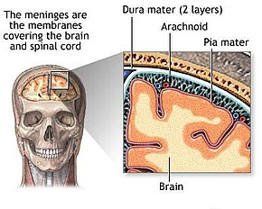 Human brains are surrounded by a system of connective tissue membranes called meninges that separate the brain from the skull. This three-layered covering is composed of (from the outside in) the dura mater, arachnoid mater, and pia mater. The arachnoid and pia are physically connected and thus often considered as a single layer, the leptomeninges. Between the arachnoid mater and the pia mater is the subarachnoid space which contains cerebrospinal fluid (CSF). This fluid circulates in the narrow spaces between cells and through the cavities in the brain called ventricles, to support and protect the brain tissue. Blood vessels enter the central nervous system through the perivascular space above the pia mater. The cells in the blood vessel walls are joined tightly, forming the blood–brain barrier which protects the brain from toxins that might enter through the blood.[32]