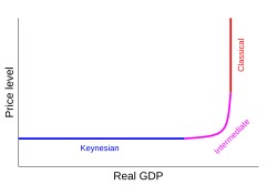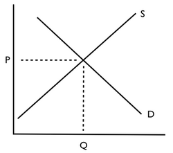 Supply is generally meant as the supply curve. The curve represents the relationship between prices and the amount of a good or service producers will offer for said prices.[2] As prices go up, producers offer more supply to capitalize on the potential revenues. The point where the supply and demand curves intersect(equilibrium) is where the price of something is determined. Some representations show the long run aggregate supply(LRAS) curve as a perfectly vertical curve that slowly shifts rightward, representing economic growth.