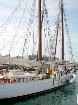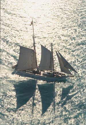Launched in 1939 by Herbert Elroy Arch, Thompson Enterprises, Western Union was built to function as a cable tender in order to maintain the communication link between Florida cities, Caribbean islands and South America.[3] The ship's frame was constructed of Cayman mahogany while all of her planking was Longleaf yellow pine from Florida. Two engines were also installed to maintain her steadiness at sea and to facilitate the cable laying process. Western Union was built to replace another schooner, John W. Atkins, in the servicing of undersea telegraph cables. While she was owned by the Western Union Thompson Fish Company, Western Union was almost immediately leased to the Western Union Telegraph Co. From 1939 to 1974, the schooner was used to check and repair the signal cable from Key West to Cuba, as well as to lay undersea telegraph cable throughout the Caribbean.[4] In all, Western Union laid more than 30,000 miles (48,000 km) of undersea telegraph cable. In 1974 she was converted into a passenger vessel. For the next decade, Western Union carried a large number of passengers, most notably musician Jimmy Buffett.[5]