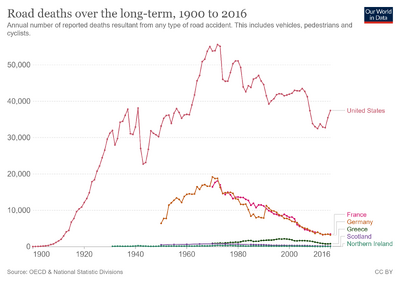 In 2010, there were an estimated 5,419,000 crashes, 30,296 deadly, killing 32,999, and injuring 2,239,000.[2] About 2,000 children under 16 die every year in traffic collisions.[3] Records indicate that there were 3,613,732 motor vehicle fatalities in the United States from 1899 to 2013.