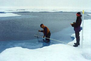 The accurate measurements of ice mass balance from ablation stakes during SHEBA showed that the greatest surface melt was observed at ponded ice, while the greatest bottom melt was observed at pressure ridges. The bottom melt of pressure ridges was 60% higher than that of undeformed first-year ice. The energy flux from solar radiation to the ocean via leads was not enough to balance the observed bottom ablation.[5] During summer period 15% of the under-ice area was covered by under-ice meltwater layers and false bottoms. The average depth of under-ice meltwater layers was 0.31 m with a salinity of 1.5. The average thickness of false bottoms was 0.2 m.[6]