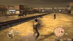 While traveling from town to town, bandit attacks are frequent and players must either escape or defend themselves. Players can hunt and kill various animals like buffalo, wild horses, and even stray dogs and farm animals. The player can also cause mayhem within communities, but can attract attention from lawmakers and other gunslingers by doing so. They act as gunslingers protecting righteousness or seek reputation as they face resistance fighters, local lawmen, renegade soldiers and vengeful Apaches and Blackfoot. A Town Patience meter goes down every time a civilian is killed. Once the patience meter reaches zero, a showdown ensues between the player and the locals.