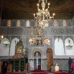 The zawiya as an institution pre-dates the arrival of formal tariqas in North Africa and traces its origins to the qubba tombs which sometimes acted as shrines and to the early ribats on the frontier of the Islamic world to which holy men sometimes retired with their followers.[4] The first zawiya buildings in Ifriqiya (present-day Tunisia) were built under Hafsid rule in the 14th century. The zawiyas of Kairouan are believed to be the oldest and are centered around the tombs of local saints. These include the Zawiya of Sidi Sahib (or Abu Zama'a al-Balawi), founded in the 14th century (though the current building dates from the 17th century), and the Zawiya of Sidi 'Abid al-Ghariani, which was also established in the 14th century.[4][9][10] The first formal zawiyas in Morocco were founded under the Marinid dynasty in the 14th century as well, most notably the zawiya built in Chellah by Abu al-Hasan and the Zawiyat an-Nussak built by his successor Abu Inan in Salé. Both examples, partly ruined today, were similar to madrasas in form and function.[4][11] In Algeria, another major example is the religious complex of Sidi Abu Madyan (or Sidi Boumediene), also founded by Abu al-Hasan and built around the older tomb of Abu Madyan (d. 1197).[5][12] In Fez, the tomb of Idris II, a sharif (descendant of Muhammad) and one of the city's founders, was rebuilt in the early 14th and early 15th centuries and maintained by his Idrisid descendants.[13] In Tunis, the Zawiya of Sidi Ben 'Arus and the Zawiya of Sidi Qasim al-Jalizi, two of the most important zawiyas in the city, were both established near the end of the 15th century around the tombs of important saints.[4]