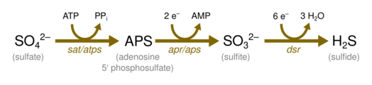 Before sulfate can be used as an electron acceptor, it must be activated. This is done by the enzyme ATP-sulfurylase, which uses ATP and sulfate to create adenosine 5'-phosphosulfate (APS). APS is subsequently reduced to sulfite and AMP. Sulfite is then further reduced to sulfide, while AMP is turned into ADP using another molecule of ATP. The overall process, thus, involves an investment of two molecules of the energy carrier ATP, which must to be regained from the reduction.[1]