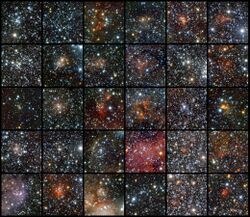 Because most if not all stars form in clusters, star clusters are to be viewed as the fundamental building blocks of galaxies. The violent gas-expulsion events that shape and destroy many star clusters at birth leave their imprint in the morphological and kinematical structures of galaxies.[31] Most open clusters form with at least 100 stars and a mass of 50 or more solar masses. The largest clusters can have over 104 solar masses, with the massive cluster Westerlund 1 being estimated at 5 × 104 solar masses and R136 at almost 5 x 105, typical of globular clusters.[27] While open clusters and globular clusters form two fairly distinct groups, there may not be a great deal of intrinsic difference between a very sparse globular cluster such as Palomar 12 and a very rich open cluster. Some astronomers believe the two types of star clusters form via the same basic mechanism, with the difference being that the conditions that allowed the formation of the very rich globular clusters containing hundreds of thousands of stars no longer prevail in the Milky Way.[32]