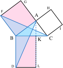 This proof, which appears in Euclid's Elements as that of Proposition 47 in Book 1, demonstrates that the area of the square on the hypotenuse is the sum of the areas of the other two squares.[12][13] This is quite distinct from the proof by similarity of triangles, which is conjectured to be the proof that Pythagoras used.[14][15]