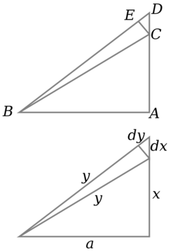 If x is increased by a small amount dx by extending the side AC slightly to D, then y also increases by dy. These form two sides of a triangle, CDE, which (with E chosen so CE is perpendicular to the hypotenuse) is a right triangle approximately similar to ABC. Therefore, the ratios of their sides must be the same, that is: