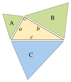 If one erects similar figures (see Euclidean geometry) with corresponding sides on the sides of a right triangle, then the sum of the areas of the ones on the two smaller sides equals the area of the one on the larger side.