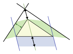 The lower figure shows the elements of the proof. Focus on the left side of the figure. The left green parallelogram has the same area as the left, blue portion of the bottom parallelogram because both have the same base b and height h. However, the left green parallelogram also has the same area as the left green parallelogram of the upper figure, because they have the same base (the upper left side of the triangle) and the same height normal to that side of the triangle. Repeating the argument for the right side of the figure, the bottom parallelogram has the same area as the sum of the two green parallelograms.