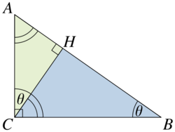 Let ABC represent a right triangle, with the right angle located at C, as shown on the figure. Draw the altitude from point C, and call H its intersection with the side AB. Point H divides the length of the hypotenuse c into parts d and e. The new triangle, ACH, is similar to triangle ABC, because they both have a right angle (by definition of the altitude), and they share the angle at A, meaning that the third angle will be the same in both triangles as well, marked as θ in the figure. By a similar reasoning, the triangle CBH is also similar to ABC. The proof of similarity of the triangles requires the triangle postulate: The sum of the angles in a triangle is two right angles, and is equivalent to the parallel postulate. Similarity of the triangles leads to the equality of ratios of corresponding sides: