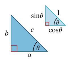 In a right triangle with sides a, b and hypotenuse c, trigonometry determines the sine and cosine of the angle θ between side a and the hypotenuse as: