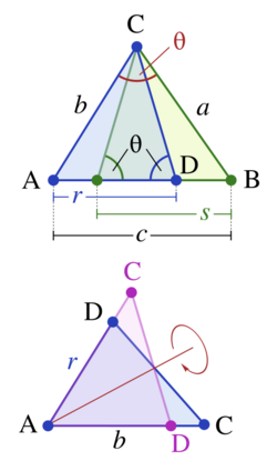 At any selected angle of a general triangle of sides a, b, c, inscribe an isosceles triangle such that the equal angles at its base θ are the same as the selected angle. Suppose the selected angle θ is opposite the side labeled c. Inscribing the isosceles triangle forms triangle CAD with angle θ opposite side b and with side r along c. A second triangle is formed with angle θ opposite side a and a side with length s along c, as shown in the figure. Thābit ibn Qurra stated that the sides of the three triangles were related as:[47][48]