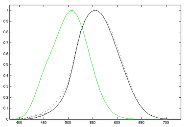 The human eye is not equally sensitive to all wavelengths of visible light. Photometry attempts to account for this by weighting the measured power at each wavelength with a factor that represents how sensitive the eye is at that wavelength. The standardized model of the eye's response to light as a function of wavelength is given by the luminosity function. The eye has different responses as a function of wavelength when it is adapted to light conditions (photopic vision) and dark conditions (scotopic vision). Photometry is typically based on the eye's photopic response, and so photometric measurements may not accurately indicate the perceived brightness of sources in dim lighting conditions where colors are not discernible, such as under just moonlight or starlight.[1] Photopic vision is characteristic of the eye's response at luminance levels over three candela per square metre. Scotopic vision occurs below 2 × 10−5 cd/m2. Mesopic vision occurs between these limits and is not well characterised for spectral response.[2][1]
