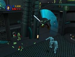 Several levels were cut from the game during development. "Bounty Hunter Pursuit" was a level based around the chase scene with bounty hunter Zam Wessel seen near the start of Attack of the Clones. Cutting it resulted in Attack of the Clones only having five levels compared to the six levels for the other two movies, with the first level picking up the story with Obi-Wan Kenobi's visit to Kamino. "Anakin's Flight" was a level based around Anakin Skywalker flying a Naboo N-1 starfighter during the space battle against the Trade Federation battleship seen in The Phantom Menace.[10] "Boga Chase" was based around the scene in Revenge of the Sith where Obi-Wan Kenobi chases General Grievous while riding a Boga.[11] "Asteroid Dogfight" was based around the Attack of the Clones scene where Obi-Wan Kenobi chases Jango Fett through the asteroid ring above Geonosis. "Bounty Hunter Pursuit" was later included as part of the Attack of the Clones levels in Lego Star Wars, with "Anakin's Flight" also being included as a bonus level.