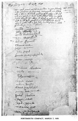 Former Boston magistrate and Hutchinson supporter William Coddington was not happy about the trials, and he began making plans for his own future in consultation with others affected by the Court's decisions. He remained on good terms with Winthrop and consulted with him about the possibility of leaving the colony in peace.[75] Winthrop was encouraging and helped to smooth the way with the other magistrates. The men were uncertain where to go; they contacted Roger Williams who suggested that they purchase land of the Indians along the Narraganset Bay, near his settlement at Providence Plantation. On 7 March 1638, a group of men gathered at the home of Coddington and drafted a compact.[76] Several of the strongest supporters of Hutchinson and Wheelwright signed the document, having been disfranchised, disarmed, or excommunicated, including John Coggeshall, William Aspinwall, John Porter, Philip Sherman, Henry Bull, and several members of the Hutchinson family. Some who were not directly involved in the events also asked to be included, such as Randall Holden and physician and theologian John Clarke.[76]