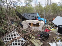 The terms unsheltered and unhoused refer to that segment of a homeless community who do not have ordinary lawful access to buildings in which to sleep; the latter term is defined by the United States Department of Housing and Urban Development (HUD) as describing persons occupying "place not designed for ... sleeping accommodation for human beings". Such persons frequently prefer the term houseless to the term homeless. Recent homeless enumeration survey documentation utilizes the term unsheltered homeless. The common colloquial term street people does not fully encompass all unsheltered people, in that many such persons do not spend their time in urban street environments. Many shun such locales, because homeless people in urban environments may face the risk of being robbed or beaten up. Some people convert unoccupied or abandoned buildings ("squatting"), or inhabit mountainous areas or, more often, lowland meadows, creek banks and beaches.[25] Many jurisdictions have developed programs to provide short-term emergency shelter during particularly cold spells, often in churches or other institutional properties. These are referred to as warming centers, and are credited by their advocates as lifesaving.[26]
