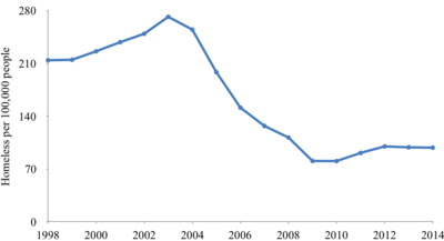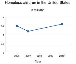 The annual number of homeless households in England peaked in 2003–04 at 135,420 before falling to a low of 40,020 in 2009–10. In 2014–15, there were 54,430 homeless households, which was 60 per cent below the 2003–04 peak.[245] United Kingdom has more than 80,000 children in temporary accommodation, a number which increases every year.[246][247] In 2007 the official figures for England [248] were that an average of 498 people slept rough each night, with 248 of those in London. It is important to note that many individuals may spend only a few days or weeks sleeping rough, and so any number for rough sleepers on a given night hides the total number of people actually affected in any one year.