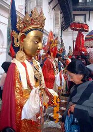 Cultural continuity has been maintained for centuries in the exclusive worship of goddesses and deities in Kathmandu and the rest of the country. These deities include the Ajima,[66] Taleju (or Tulja Bhavani or Taleju Bhawani)[67] and her other form : Digu Taleju (or Degu Taleju)[68] and Kumari (the living goddess).[69] The artistic edifices have now become places of worship in the everyday life of the people, therefore a roster is maintained to observe annual festivals. There are 133 festivals held in the year.[70]