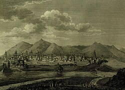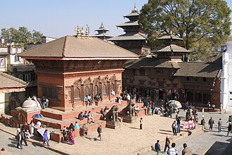 Eventually, the Licchavi ruler Gunakamadeva merged Koligram and Dakshin Koligram, founding the city of Kathmandu.[23] The city was designed in the shape of Chandrahrasa, the sword of Manjushri. The city was surrounded by eight barracks guarded by Ajimas. One of these barracks is still in use at Bhadrakali (in front of Singha Durbar). The city served as an important transit point in the trade between India and Tibet, leading to tremendous growth in architecture. Descriptions of buildings such as Managriha, Kailaskut Bhawan, and Bhadradiwas Bhawan have been found in the surviving journals of travellers and monks who lived during this era. For example, the famous 7th-century Chinese traveller Xuanzang described Kailaskut Bhawan, the palace of the Licchavi king Amshuverma.[24] The trade route also led to cultural exchange as well. The artistry of the Newar people—the indigenous inhabitants of the Kathmandu Valley—became highly sought after during this era, both within the Valley and throughout the greater Himalayas. Newar artists travelled extensively throughout Asia, creating religious art for their neighbours. For example, Araniko led a group of his compatriot artists through Tibet and China. Bhrikuti, the princess of Nepal who married Tibetan monarch Songtsän Gampo, was instrumental in introducing Buddhism to Tibet.