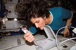 The S6 Truss was swabbed in space on flight day 5, March 19, 2009, during the first spacewalk by Steve Swanson (EV1) and Richard R. Arnold (EV2). This 'swab' was performed indirectly with the spacesuit gloves. The gloves themselves were swabbed inside the ISS both before and after EVA, with LOCAD-PTS, by Expedition 18 Flight Engineer Sandy Magnus. Swab samples were then analyzed aboard the ISS by Magnus on flight day 7, March 21, 2009. This experiment marked the first time in human spaceflight that EVA crew checked themselves for microbes before EVA, and was mentioned by the STS-119 crew to President Obama during a video conference from space during STS-119.[26] This type of procedure will be required to monitor and document the spread of biological material in support of NASA's goal to search for life on other planets[27] and to comply with planetary protection regulations.