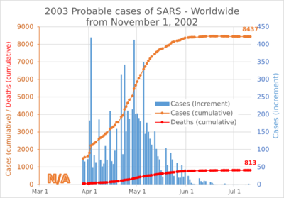 ↑"Summary of probable SARS cases with onset of illness from 1 November 2002 to 31 July 2003". World Health Organization. 21 April 2004. https://www.who.int/csr/sars/country/table2004_04_21/en/.