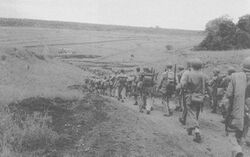 Hyakutake's soldiers conducted several assaults over three days at various locations around the Lunga perimeter. Along the Matanikau River, the principal river flowing through what is now central Honiara, tanks attacked in pairs across the sandbar at the mouth of the river behind a barrage of artillery. Artillery, including 37 mm (1.5 in) anti-tank guns, quickly destroyed all nine tanks. At the same time, four battalions of Marine artillery, totalling 40 howitzers, fired over 6,000 rounds into the area between Point Cruz and the Matanikau, causing heavy casualties in Nomasu Nakaguma's infantry battalions as they tried to approach the Marine lines. Both sides incurred heavy losses during the events of the overall battle, especially the Japanese attackers.[10] After an attempt to deliver further reinforcements failed during the Naval Battle of Guadalcanal in November 1942, Japan conceded defeat in the struggle for the island and evacuated many of its remaining forces by the first week of February 1943. The Quonset hut built by the Americans can still be seen in the back lanes of the town and several memorials give testament to the war.[11]