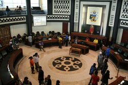 The Solomon Islands Parliament Building, located on the hill above Hibiscus Avenue, built with American aid, is a concrete structure of conical-shape, which was inaugurated in 1993. The dome has tapestry, frescoes, and traditional artwork. The parliament building was built at a cost of US$5 million in honour of the 450 U.S. soldiers and 1,200 Marines who died during the Guadalcanal operations during the war. Ironically the building was originally built by a Japanese firm.[9][43]