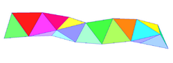 There are 13 infinite families of three-dimensional line groups,[1] derived from the 7 infinite families of axial three-dimensional point groups. As with space groups in general, line groups with the same point group can have different patterns of offsets. Each of the families is based on a group of rotations around the axis with order n. The groups are listed in Hermann-Mauguin notation, and for the point groups, Schönflies notation. There appears to be no comparable notation for the line groups. These groups can also be interpreted as patterns of wallpaper groups[2] wrapped around a cylinder n times and infinitely repeating along the cylinder's axis, much like the three-dimensional point groups and the frieze groups. A table of these groups: