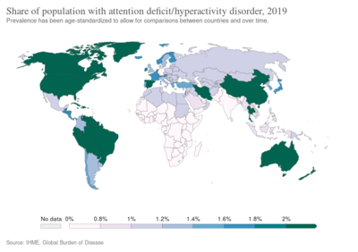 Despite being the most commonly studied and diagnosed mental disorder in children and adolescents, the exact cause is unknown in the majority of cases.[4] Genetic factors are estimated to make up about 75% of the risk.[19] Nicotine exposure during pregnancy may be an environmental risk.[20] It does not appear to be related to the style of parenting or discipline.[21] It affects about 5–7% of children when diagnosed via the DSM-IV criteria[2][22] and 1–2% when diagnosed via the ICD-10 criteria.[23] As of 2015, it was estimated to affect about 51.1 million people globally.[10] Rates are similar between countries and depend mostly on how it is diagnosed.[24] ADHD is diagnosed approximately two times more often in boys than in girls,[2] although the disorder is often overlooked in girls because their symptoms differ from those of boys.[25][26][27] About 30–50% of people diagnosed in childhood continue to have symptoms into adulthood and between 2–5% of adults have the condition.[28][29][30] In adults inner restlessness rather than hyperactivity may occur.[31] They often develop coping skills which make up for some or all of their impairments.[32] The condition can be difficult to tell apart from other conditions, as well as to distinguish from high levels of activity that are still within the range of normal behaviors.[16]