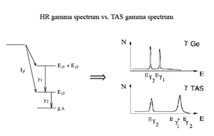 There is a change in philosophy when measuring with a TAS. Instead of detecting the individual gamma rays (as high-resolution detectors do), it will detect the gamma cascades emitted in the decay. Then, the final energy spectrum will not be a collection of different energy peaks coming from the different transitions (as can be expected in the case of a germanium detector), but a collection of peaks situated at an energy that is the sum of the different energies of all the gammas of the cascade emitted from each level. This means that the energy spectrum measured with a TAS will be in reality a spectrum of the levels of the nuclei, where each peak is a level populated in the decay. Since the efficiency of these detectors is close to 100%, it is possible to see the feeding to the high excitation levels that usually can not be seen by high-resolution detectors. This makes total absorption spectroscopy the best method to measure beta feedings and provide accurate beta intensity (Iβ) distributions for complex decay schemes.