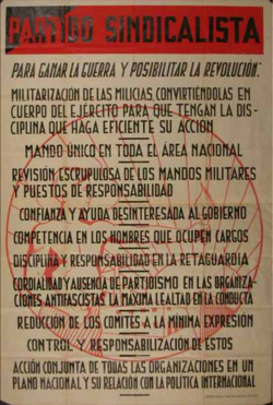 The Syndicalist Party (Spanish: Partido Sindicalista; Catalan: Partit Sindicalista) was a left-wing political party in Spain, formed by Ángel Pestaña in 1932. Pestaña, a leading member of the Confederación Nacional del Trabajo (CNT) trade union, formed the party in response to the growing influence of the Iberian Anarchist Federation over the CNT. He and other notable members of the CNT had previously signed a Manifest dels Trenta ("Manifesto of the Thirty"), which had got them expelled.[2]