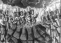 In July, the crusaders captured the small village of Servian and headed for Béziers, arriving on July 21. They surrounded the city, called the Catholics within to come out, and demanded that the Cathars surrender.[12] Both groups refused to comply. The city fell the following day when an abortive sortie by the defenders was pursued back through the open city gates.[13] The entire population, regardless of faith, was slaughtered, and the city was burned to the ground. Contemporary sources give estimates of the number of dead ranging between 7,000 to 20,000. The latter figure appears in the papal legate Arnaud-Amaury's own report to the pope, in which he admits that no one was spared.