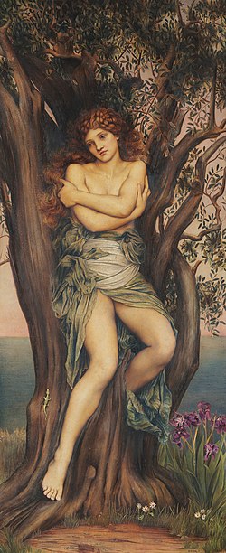 A dryad (; Greek: Δρυάδες, sing.: Δρυάς) is a tree nymph or tree spirit in Greek mythology. Drys (δρῦς) signifies "oak" in Greek. Dryads were originally considered the nymphs of oak trees specifically, but the term has evolved towards tree nymphs in general.[1] Often their life force was connected to the tree in which they resided and they were usually found in sacred groves of the gods.[2] They were considered to be very shy creatures except around the goddess Artemis, who was known to be a friend to most nymphs.