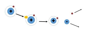 Penning ionization refers to the interaction between an electronically excited gas-phase atom G* and a target molecule M. The collision results in the ionization of the molecule yielding a cation M+., an electron e−, and a neutral gas molecule, G, in the ground state.[4] Penning ionization occurs via formation of a high energy collision complex, evolving toward the formation of a cationic species, by ejecting a high energy electron.[5]