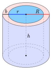 A right circular hollow cylinder (or cylindrical shell) is a three-dimensional region bounded by two right circular cylinders having the same axis and two parallel annular bases perpendicular to the cylinders' common axis, as in the diagram.