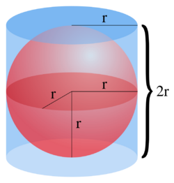 In the treatise by this name, written c. 225 BCE, Archimedes obtained the result of which he was most proud, namely obtaining the formulas for the volume and surface area of a sphere by exploiting the relationship between a sphere and its circumscribed right circular cylinder of the same height and diameter. The sphere has a volume two-thirds that of the circumscribed cylinder and a surface area two-thirds that of the cylinder (including the bases). Since the values for the cylinder were already known, he obtained, for the first time, the corresponding values for the sphere. The volume of a sphere of radius r is 4/3πr3 = 2/3 (2πr3). The surface area of this sphere is 4πr2 = 2/3 (6πr2). A sculpted sphere and cylinder were placed on the tomb of Archimedes at his request.
