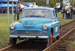 A draisine of the Warszawa was also produced and was used by the Polish State Railways, mainly for field trips for inspections. Production of this variant was between 1956-1973. Most draisines were sedan models although pickup models were also built. A small number of station wagons were also built for export markets. The steering system was made for driving straight ahead, and a turntable was mounted under the chassis (a screw jack was used to rotate the trolley on the track, after it was lifted, in order to allow driving in both directions at full speed). With further changes, the rear light was modified (red lights at the front instead of the direction indicators and white light at the rear instead of the stop), the brushes in front of the wheels were installed and the suspension was tied with steel cables (to facilitate lifting the car). The maximum speed was 105 km / h, but due to the long braking distance on the track, PKP regulations then limited it to 80 km / h.