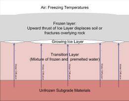 Frost heave is the process by which the freezing of water-saturated soil causes the deformation and upward thrust of the ground surface.[3] This process can distort and crack pavement, damage the foundations of buildings and displace soil in regular patterns. Moist, fine-grained soil at certain temperatures is most susceptible to frost heaving.