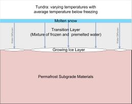 Frost heave is common in arctic tundra because the permafrost maintains ground frozen at depth and prevents snowmelt and rain from draining. As a result, conditions are optimal for deep ice lens formation with large ice accumulations and significant soil displacement.[4]
