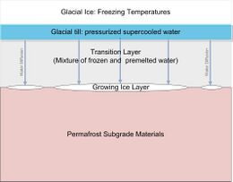 Ice lens growth within the bedrock below the glacier is projected during the summer months when there is ample water at the base of the glacier. Ice lenses will form within the bedrock, accumulating until the rock is sufficiently weakened that it shears or spalls off. Layers of rock along the interface between glaciers and the bedrock are freed, producing much of the sediments in these basal regions of glaciers. Since the rate of glacier movement is dependent upon the characteristics of this basal ice, research is ongoing to better quantify the phenomena.[6]