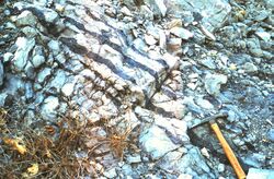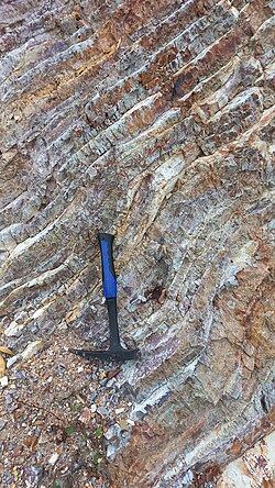 Bedded chert, also known as ribbon chert, takes the form of thinly bedded layers (a few centimeters to a meter in thickness[22]) of nearly pure chert separated by very thin layers of silica-rich shale.[23] It is usually black to green in color, and the full sequence of beds may be several hundred meters thick. The shale is typically black shale, sometimes with pyrite, indicating deposition in an anoxic environment.[21] Bedded chert is most often found in association with turbidites, deep water limestone, submarine volcanic rock,[23] ophiolites, and mélanges on active margins of tectonic plates.[24] Sedimentary structures are rare in bedded cherts.[23] The typically high purity of bedded chert, like the high purity of other chemically precipitated rock, points to deposition in areas where there is little influx of detrital sediments (such as river water laden with silt and clay particles.)[25] Such impurities as are present include authigenic pyrite and hematite, formed in the sediments after they were deposited, in addition to traces of detrital minerals.[8]