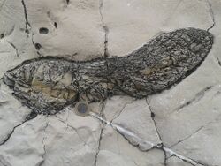 Chert is typically composed of the petrified remains of siliceous ooze, the biogenic sediment that covers large areas of the deep ocean floor, and which contains the silicon skeletal remains of diatoms, silicoflagellates, and radiolarians.[4] Precambrian cherts are notable for the presence of fossil cyanobacteria.[5] In addition to microfossils,[4] chert occasionally contains macrofossils.[6][7] However, some chert is devoid of any fossils.[8]