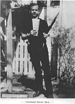 The "backyard photos," which were taken by Marina Oswald, probably around Sunday, March 31, 1963, show Oswald dressed all in black and holding two Marxist newspapers—The Militant and The Worker—in one hand, a rifle in the other, and carrying a pistol in its holster. The backyard photos were shot using a camera belonging to Oswald, an Imperial Reflex Duo-Lens 620. When shown the pictures at Dallas Police headquarters after his arrest, Oswald insisted they were fakes. However, Marina Oswald testified in 1964 that he had taken them. These photos were labelled CE 133-A and CE 133-B. CE 133-A shows the rifle in Oswald's left hand and newsletters in front of his chest in the other, while rifle is held with the right hand in CE 133-B. Oswald's mother testified that on the day after the assassination she and Marina destroyed another photograph with Oswald holding the rifle with both hands over his head, with "To my daughter June" written on it.[17]