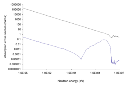 A composite high-density concrete, or alternatively, a laminated graded-Z shield, 24 units thick of which 16 units are iron and 8 units are polyethylene containing boron (BPE), and additional mass behind it to attenuate neutron capture gamma rays, is more effective than just 24 units of pure iron or BPE alone, due to the advantages of both iron and BPE in combination. During neutron transport, iron is effective in slowing down/scattering high-energy neutrons in the 14-MeV energy range and attenuating gamma rays, while the hydrogen in polyethylene is effective in slowing down these now slower fast neutrons in the few MeV range, and boron 10 has a high absorption cross section for thermal neutrons and a low production yield of gamma rays when it absorbs a neutron.[51][52][53] The Soviet T-72 tank, in response to the neutron bomb threat, is cited as having fitted a boronated[54] polyethylene liner, which has had its neutron shielding properties simulated.[48][55]