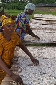 In Ghana, cassava is peeled, boiled until tender, and pounded in a large wooden mortar and pestle until it becomes homogeneous. This is called fufu. It is eaten with soup.