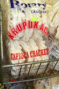 Krupuk, or traditional Indonesian crackers, is a significant use of tapioca starch in Indonesia. The most common krupuk is kerupuk kampung or kerupuk aci made of tapioca starch. The tapioca starch might be flavored with minced shrimp as krupuk udang (prawn cracker) or krupuk ikan (fish cracker). The thinly sliced or sometimes quite thick cassava was also sun-dried and deep fried to be made as kripik singkong crackers (cassava chips or tapioca chips). A variant of hot and spicy kripik singkong coated with sugar and chili pepper is known as kripik balado[17] or keripik sanjay, a specialty of Bukittinggi city in West Sumatra.